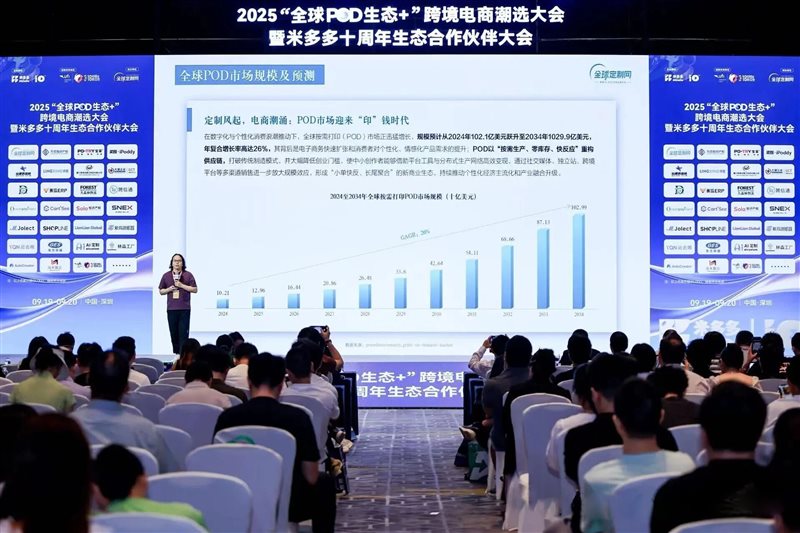 “POD市场的爆发绝非偶然,而是多重因素共振的结果。从数据来看,全球POD市场规模预计将从2024年的102.1亿美元飙升至2034年的1029.9亿美元,十年间年复合增长率高达26%,妥妥的‘印’钱赛道。”全球定制网创始人兼CEO刘宏表示,POD市场的爆发,背后是电子商务快速扩张和消费者对个性化、情感化产品需求的提升。
