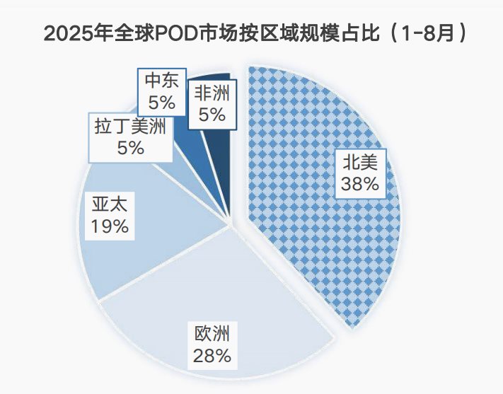 从区域格局看,当前全球POD市场呈现出明显的“三极主导、多极发育”格局,北美、欧洲与亚太三大区域共同占据市场核心份额,形成战略稳定性的“三足鼎立”态势;而拉丁美洲、中东及非洲目前虽各自仅占约5%,却预示着POD全球化进程中尚未完全释放的长尾潜力;其中,亚太地区凭借电子商务和定制需求的强劲增长,成为当前全球POD市场增长最快的区域。