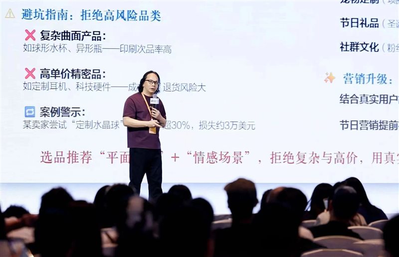 反之,复杂曲面产品(如球形水杯、异形瓶——印刷次品率高)、高单价精密品(如定制耳机、科技硬件——成本高、退货风险大),这类高风险品类则要慎重考虑。曾某卖家尝试“定制水晶球”,次品率超30%,损失约3万美元。