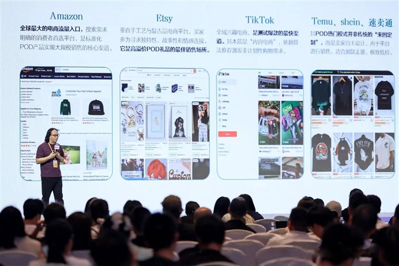 大会同期举行的POD专场论坛,全球定制网CMOLily、广东宝采智能科技联合创始人翁志伟、Temu家居装饰品类目POD招商运营负责人大鹏、灵图设计市场商务负责人简影、Temu平台艺术品类负责人玖天、Temu服装行业招商运营孟伯约、厦门育创谷科技总经理等资深POD行业人士,则围绕POD爆款路径、供应链新生态、AI设计、类目商机以及旺季流量运营给出极具参考价值的落地建议。
